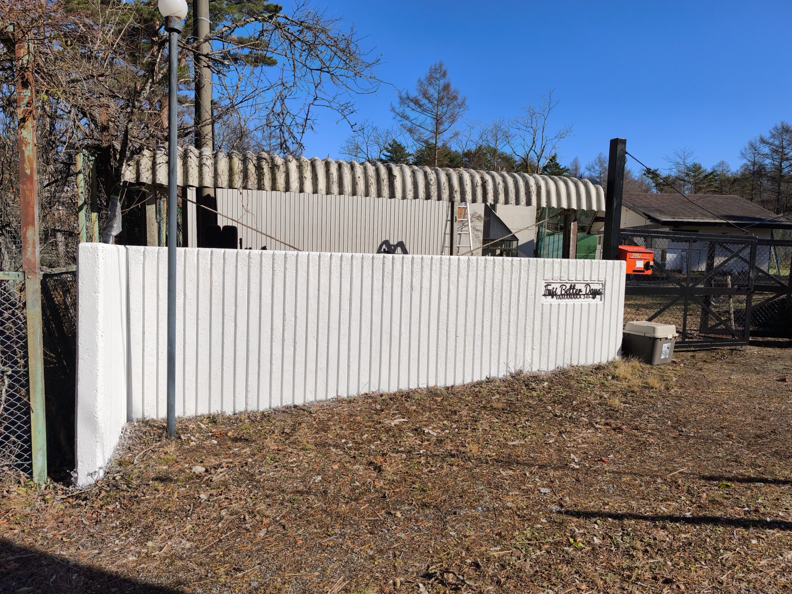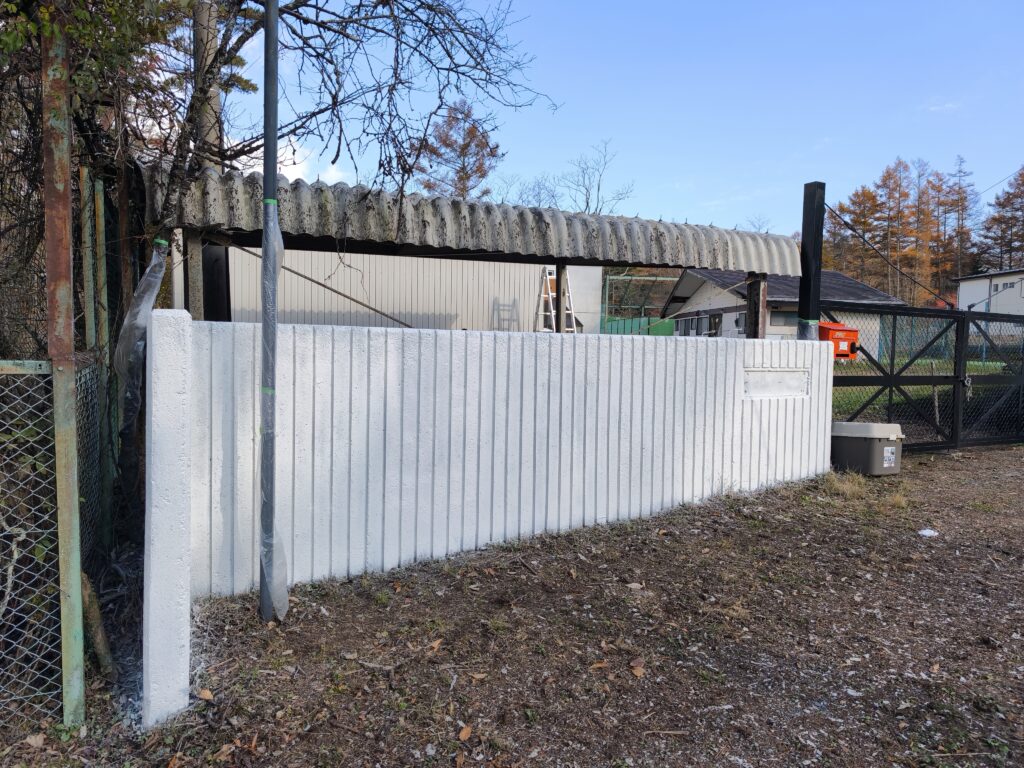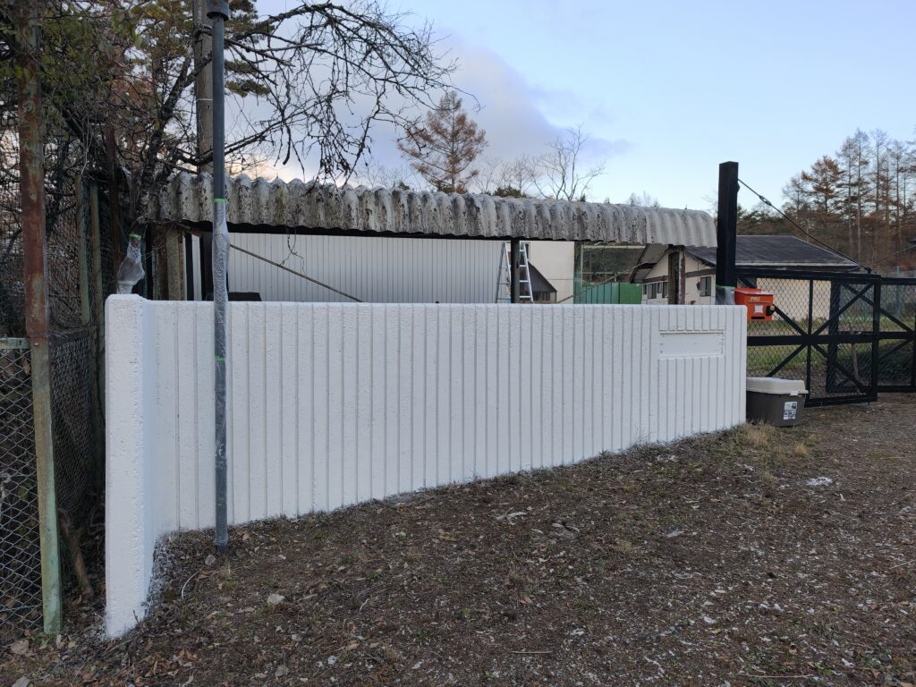 門壁の塗装とサインプレートの取付 施設 X Facebook はてブ LINE Pinterest コピー 2025.12.09 塗装作業前(11月4日) 下地一度塗後(11月15日)刷毛塗り 下地二度塗後、上塗り塗装一度塗(11月19日)スプレー塗装 門壁にプレートを取り付けました(11月28日) 下塗り塗料 エスケー化研 水性ソフトサーフSG 上塗り塗料 プリーズコート つや有り 16kg 白・淡彩〜濃彩色 エスケー化研 SR-163